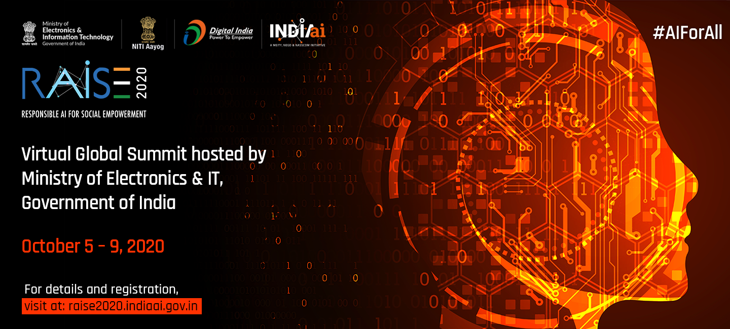 October 01, 2020We are pleased to inform you that Government of India, is organizing a virtual summit on Artificial Intelligence- Responsible AI for Social Empowerment (RAISE 2020) from 5th - 9thOctober, 2020. The Hon’ble Prime Minister of India, Shri Narendra Modi has kindly consented to inaugurate this event on 5th October, 2020. The theme of the online summit is Responsible AI for Social Empowerment.