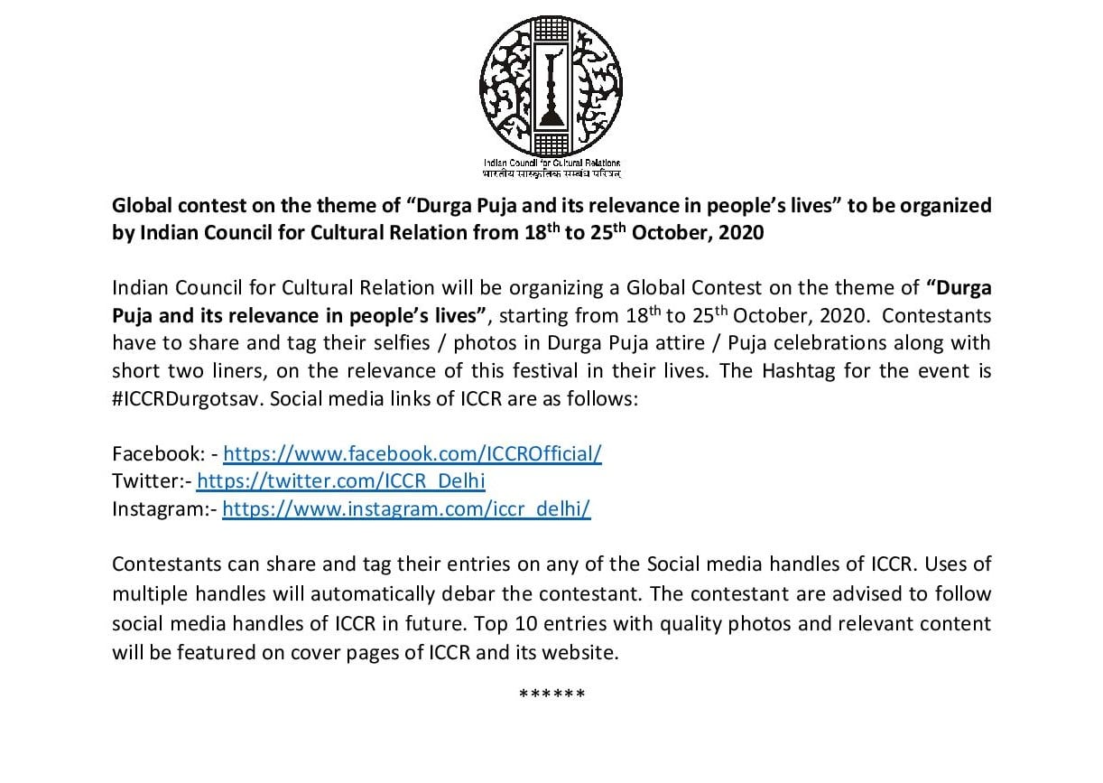 ICCR Durgotsav Contest: A Global Contest On The Theme Of “ Durga Puja And Its Relevance In People’s Lives”, Starting From 18th To 25th October, 2020