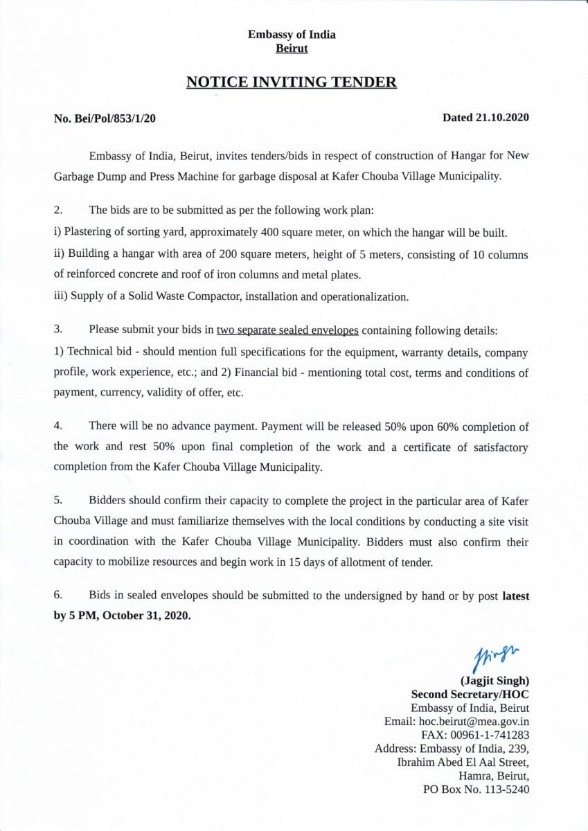 Notice Inviting Tender - Garbage Plant In Kafarchouba