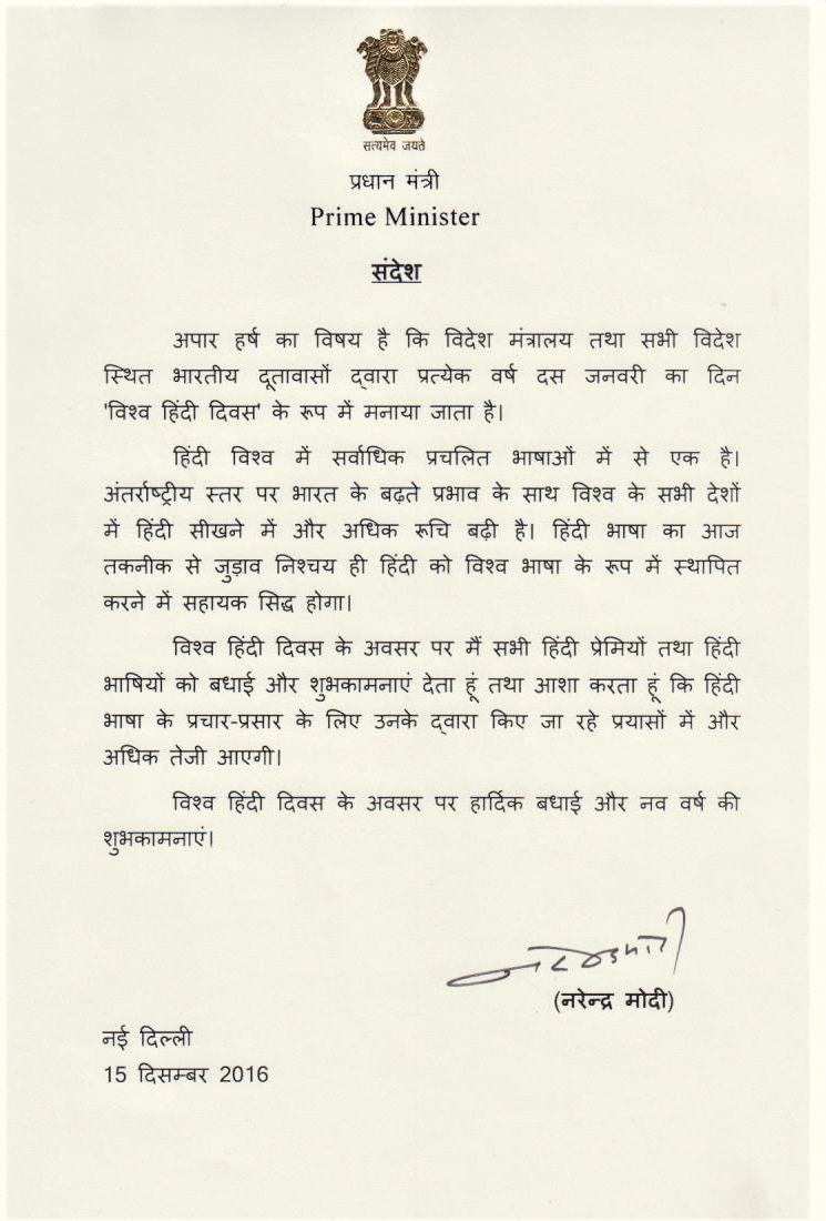 Hon’ble PM’s Message On World Hindi Day On 10 January 2017