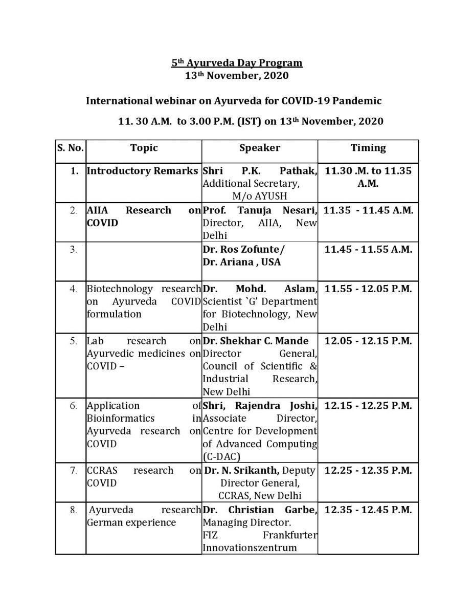 November 12, 2020Ministry of AYUSH will be organizing an international webinar on the theme “Ayurveda for COVID19 pandemic” on the occasion of 5th Ayurveda Day 2020. Timings of the webinar will be from 11.30 am to 03.00 pm IST (08.00 am to 11.30 am local time).