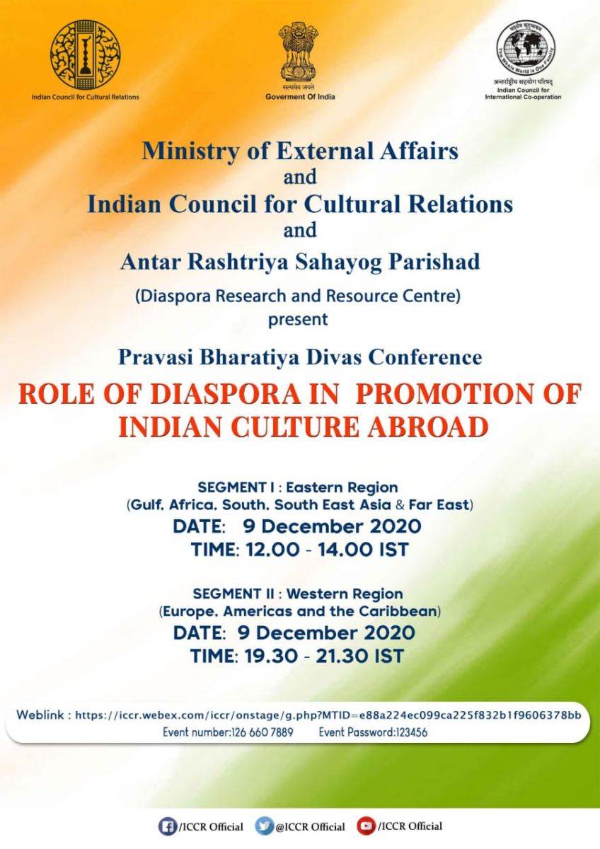 December 03, 2020Indian Council For Cultural Relations & Diaspora Research & Resource Centre are organizing a virtual conference- "Role of Diaspora in promotion of Indian culture abroad" on 9th December.