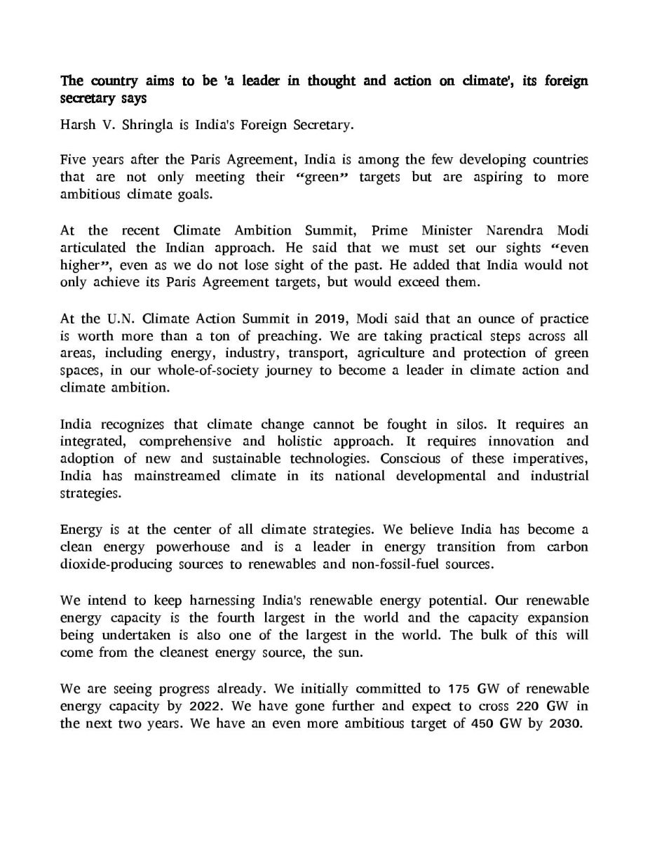 Op-ED By Foreign Secretary On India's Climate Goals & Actions - English