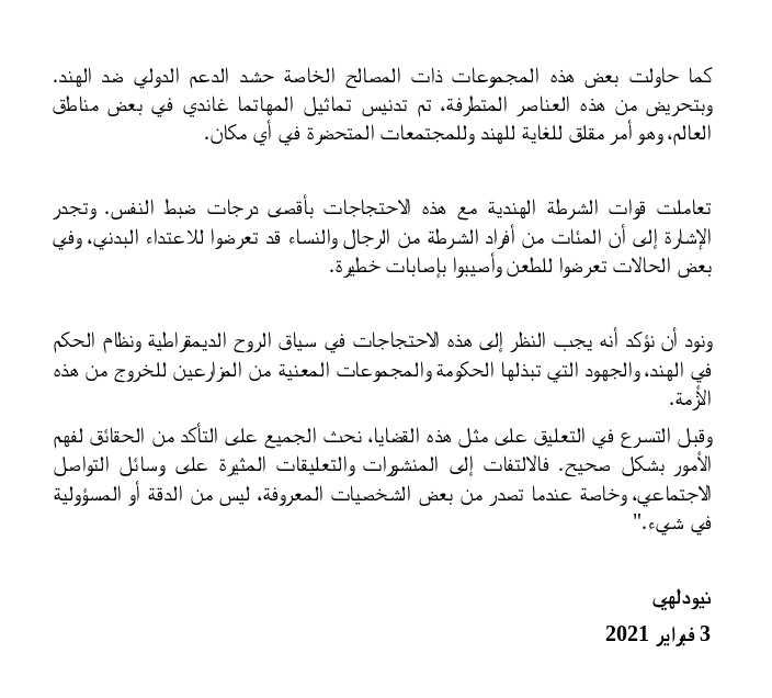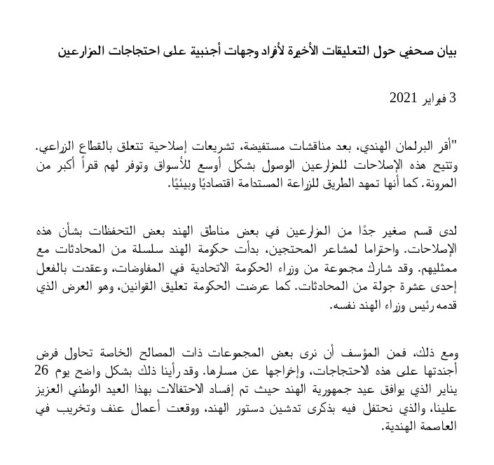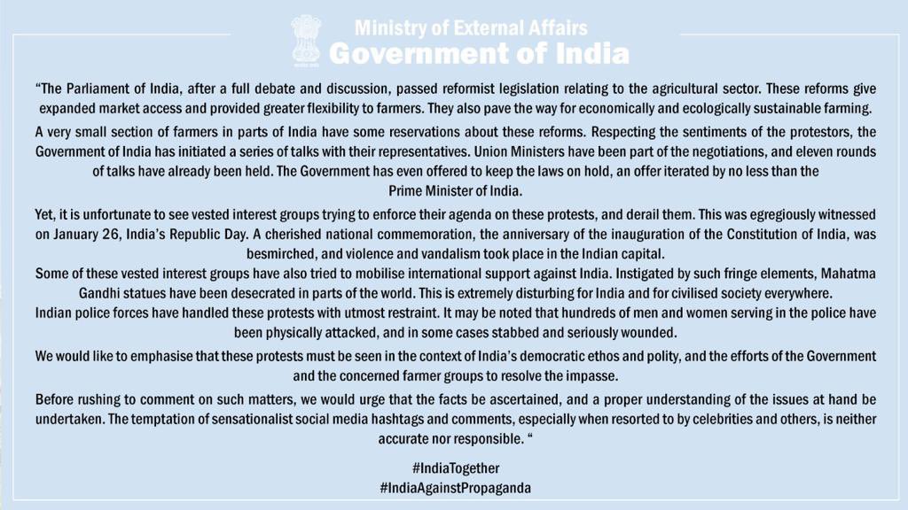 Press Statement On Recent Comments By Individuals And Foreign Entities On Farmers' Protests