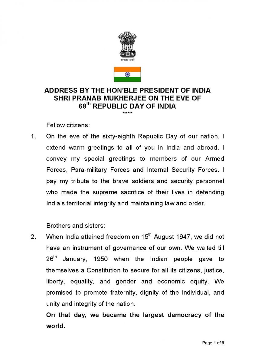 Address By The Hon’ble President Of India On The Eve Of 68th Republic Day Of India