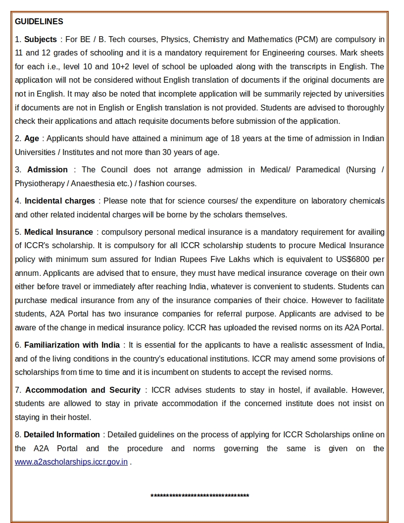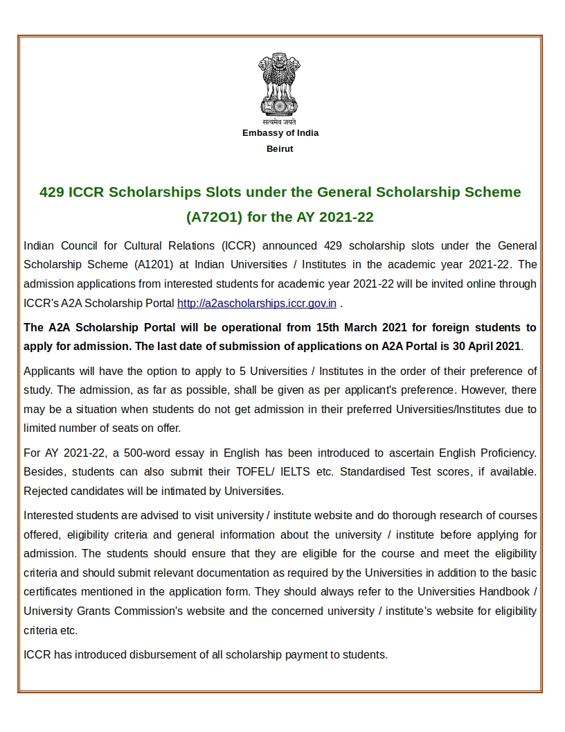 429 ICCR Scholarships Slots Under The General Scholarship Scheme (A72O1) For The AY 2021-22