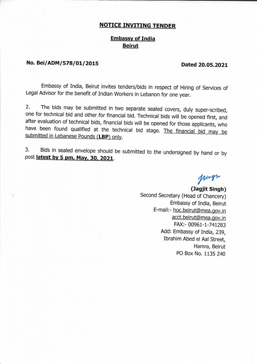 Hiring Of Services Of Legal Advisor For Embassy Of India In Lebanon For One Year - 2021