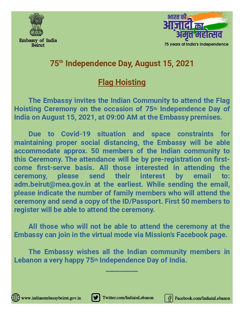 July 30, 2021Embassy of India, Beirut will celebrate 75th Independence Day of India at 09:00 AM on 15th August 2021 in a restricted mode in view of Covid-19 guidelines. Members of Indian Community may send their names with proof of ID/Passport to register themselves.