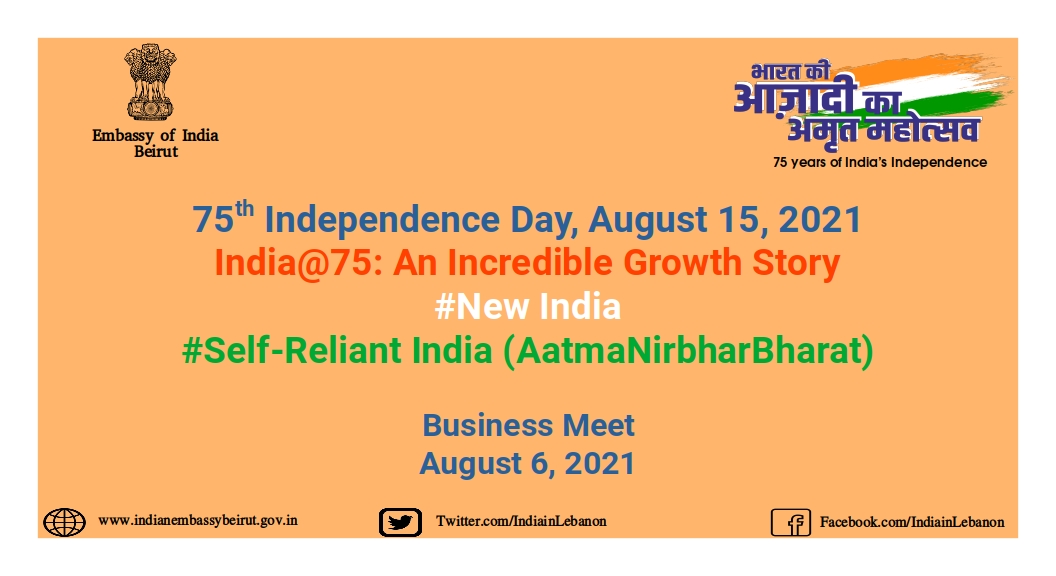 As part of ongoing activities related to Azadi Ka Amrit Mahotsav and on the occasion of upcoming 75th Independence Day of India, Embassy of India will organise a Business Meet and Gala Dinner under the theme “India@75: An Incredible Growth Story” on August 6, 2021. The Meet will be attended by representative of various Chambers of Commerce and other top businessmen from Beirut, Saida, Bekka, Choufeiat and Mount Lebanon.