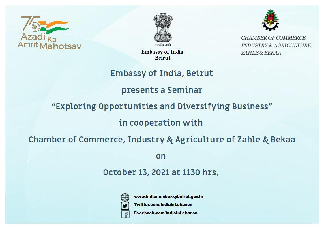 The Embassy, in association with Chamber of Commerce, Industry & Agriculture of Zahle & Bekka, brings a Seminar on exploring new business opportunities between India and Lebanon on October 13, 2021.