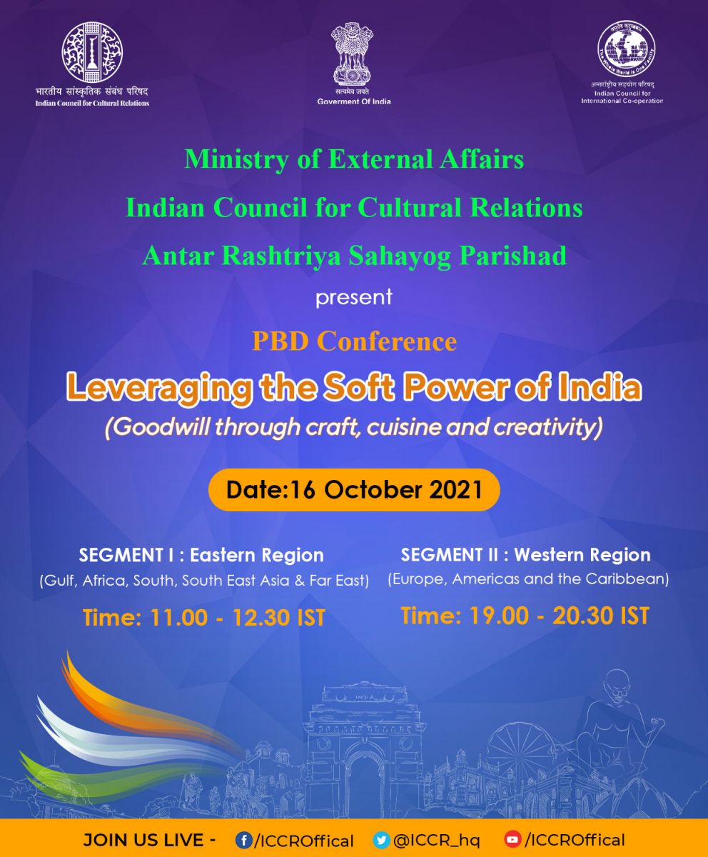 Indian Council for Cultural Relations (ICCR) is organizing an international conference “Leveraging the Soft Power of India – Goodwill through Craft, Cuisine and Creativity”, jointly with Ministry of External Affairs and Antar Rashtriya Sahyog Parishad (ARSP) on 16 October 2021 in virtual mode.