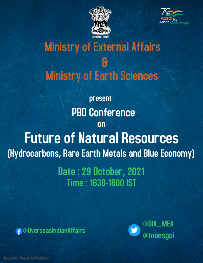 Pravasi Bharatiya Divas Conference on "Future of Natural Resources ( Hydrocarbons, Rare Earth Metals and Blue Economy)" will be organised by Ministry of External Affairs in collaboration with Ministry of Earth Sciences on 29 October 2021 from 1630 hrs to 1800 hrs IST. The conference will be live-streamed on MEA YouTube channel: https://www.youtube.com/c/MEAIndia/featured