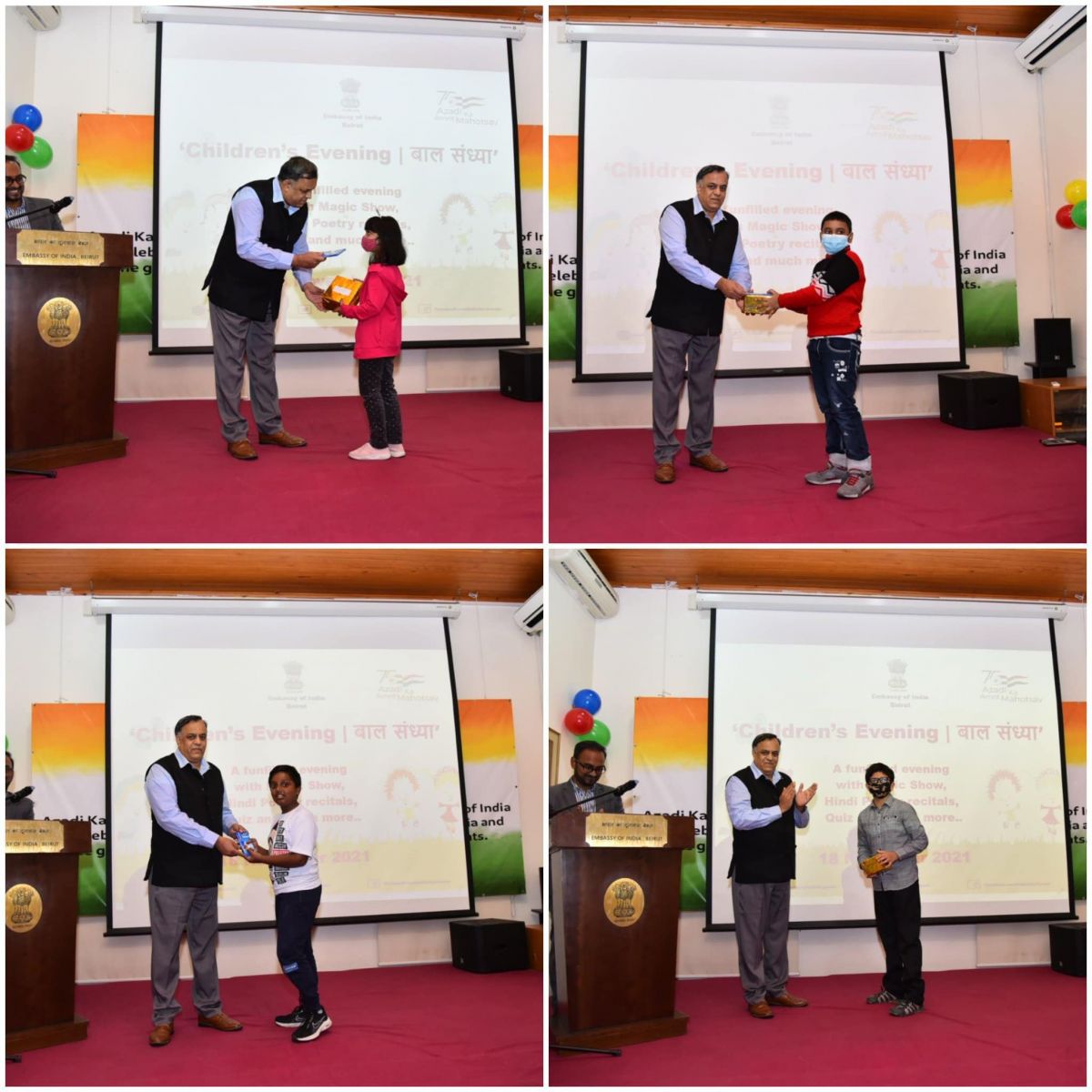As part of Azadi ka Amrit Mahotsav, the Embassy organized a fun-filled & informative evening at the Embassy with the participation of Diaspora & Lebanese children on November 18. Children recited poems in Hindi. Master Srijan Khawas, Ms Anika Chandel and Master Ashmit Chandel presented following poems in Hindi: