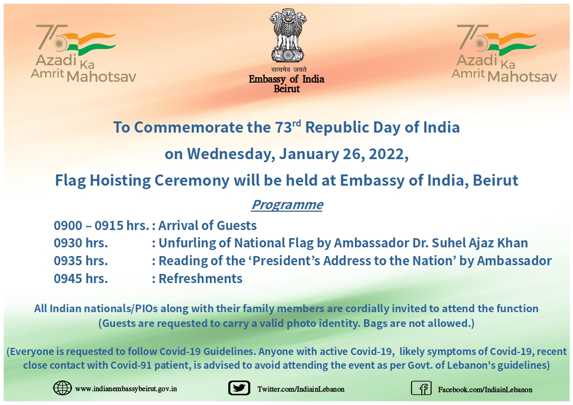 Ambassador Dr. Suhel Ajaz Khan will hoist the Indian Flag on the occasion of Republic Day of India on January 26, 2022. All Indians are invited to attend.