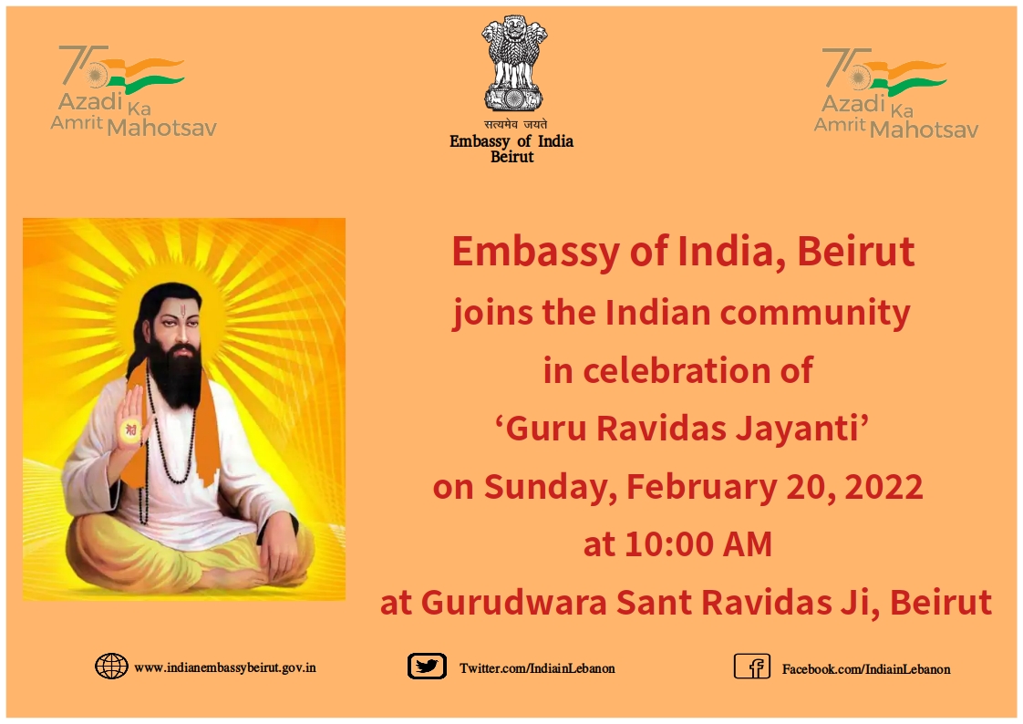 Embassy of India, Beirut joins Gurudwara Sant Ravidas Ji in celebration of Guru Ravidas Jayanti on Sunday, February 20, 2022.