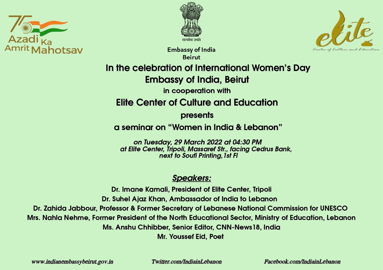 Embassy of India presents a Seminar in Tripoli on "Women in India & Lebanon" with an eminent panel of speakers from India & Lebanon on March 29, 2022.