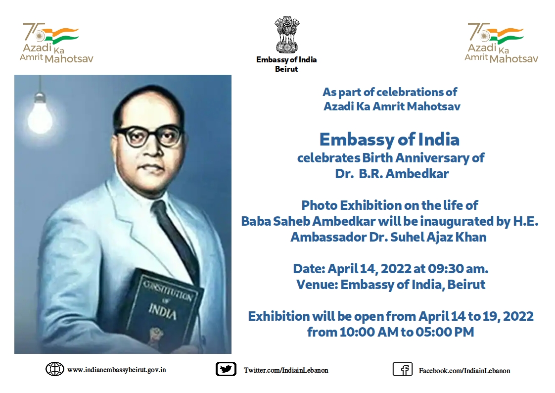 On the Birth Anniversary of Dr B. R. Ambedkar the Embassy invites all the Indian community members & friends of India to a Photo Exhibition at the Embassy on April 14th.