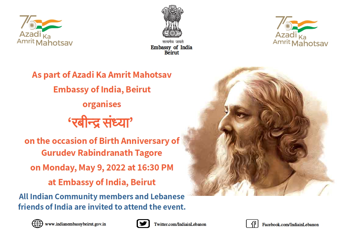 May 06, 2022As part of Azadi Ka Amrit Mahotsav, Embassy of India, Beirut organises, ‘रबीन्द्र संध्या’, on the occasion of Birth Anniversary of Gurudev Rabindranath Tagore on Monday, May 9, 2022 at 16:30 PM at Embassy of India, Beirut. All Indian Community members and Lebanese friends of India are invited to attend the event.