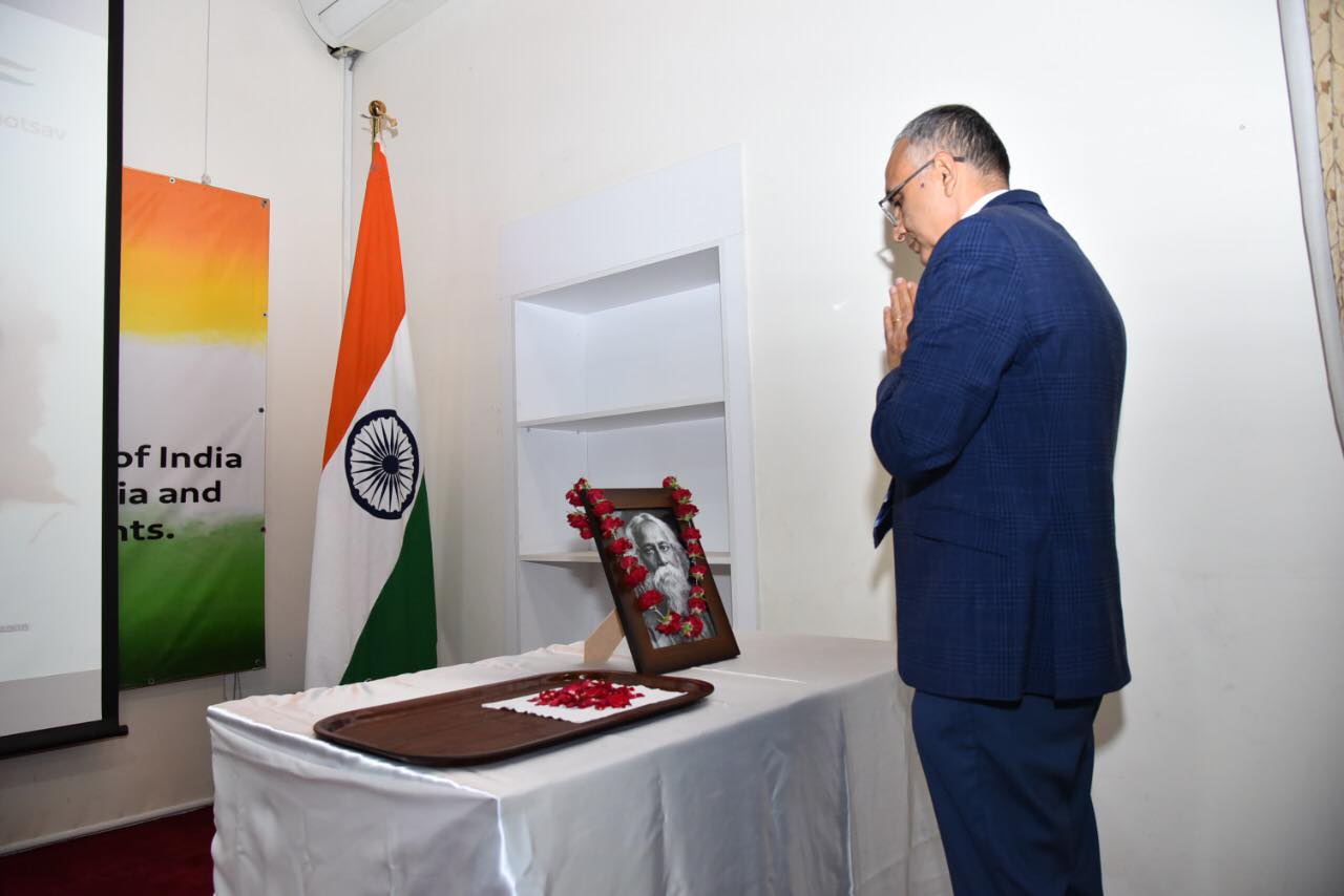 May 10, 2022As part of Azadi Ka Amrit Mahotsav, the Embassy observed Rabindranath Tagore Jayanti on May 9, 2022. The event was joined by members of Indian Community Members and all staff members of the Mission. The event included screening of short movie on Gurudev Rabindranath Tagore, recital of poem and songs by the officials of the Mission.