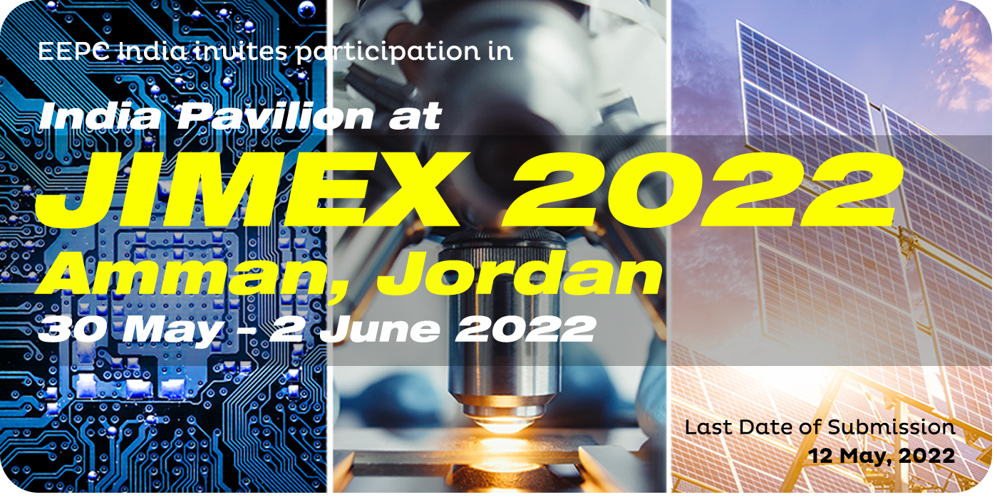 May 19, 2022We are happy to inform you that EEPC India, the nodal body for the promotion of investment and trade in the engineering sector in India, having more than 12,000 members under its banner consisting of large corporate houses, small & medium enterprises, merchandise exporters and trade associations, is organizing India Pavilion with the support of Ministry of Commerce, Government of India in JIMEX 2022, at Jordan Center for International Exhibitions; Beside Mecca Mall, Al-Aayan Street, Amman from 30 May – 2 June 2022. EEPC India is bringing a delegation of nearly 20 companies engaged in the manufacturing of variety of engineering items to exhibit their products in the biggest industrial exhibition in Jordan and the nearby region.