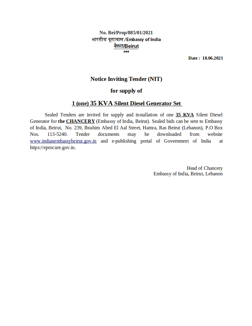 Embassy of India, Beirut publishes Tender for Supply of Generator Set for Chancery- 35 KVA.