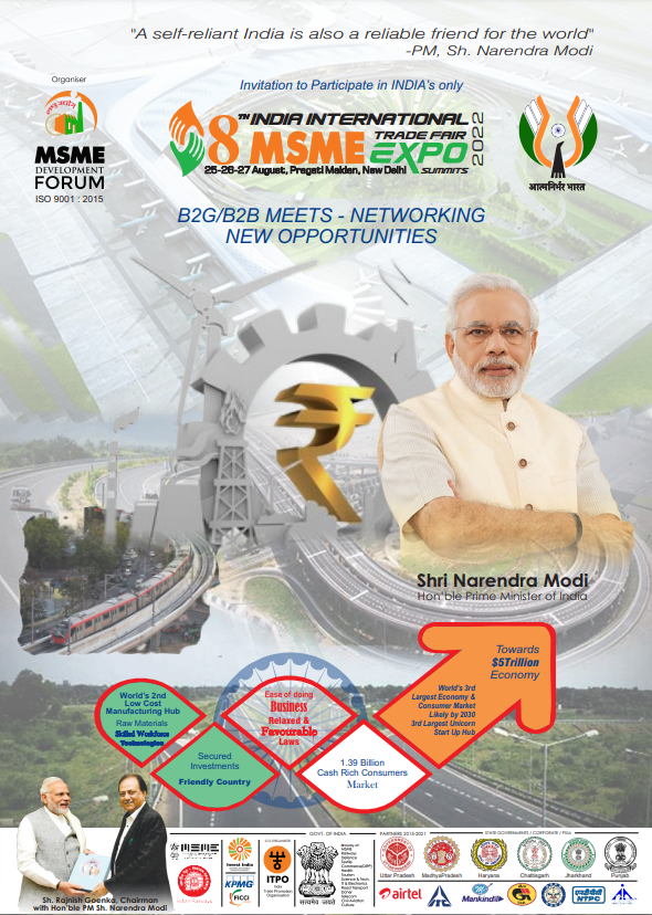 June 15, 2022It is to inform that the "8th India International MSME Start-up Expo, Trade Fair & Summit -2022" is being organized by MSME Development Forum from 25-27 August, 2022 at Pragati Maidan, New Delhi.