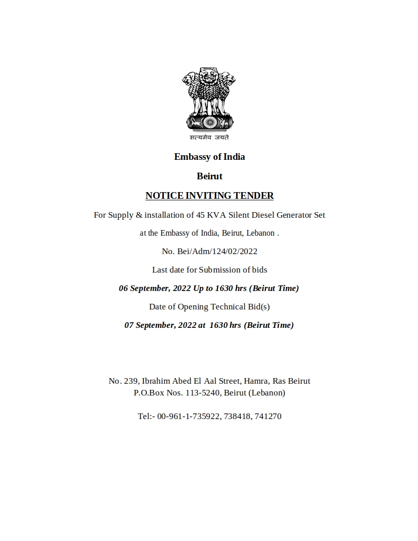 Generator for the Embassy of India, Beirut. Sealed bids can be sent to Embassy of India,