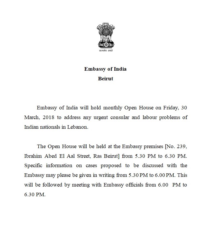 Embassy's Monthly Open House To Address Any Urgent Consular And Labour Problems Of Indian Nationals In Lebanon - March 2018