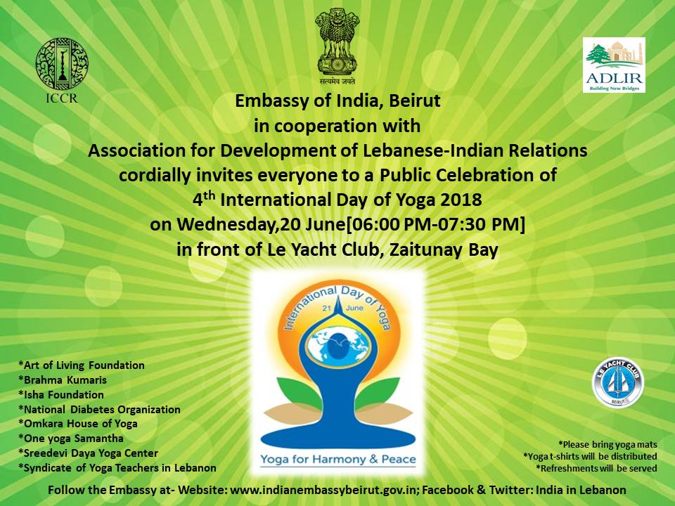 Public Celebration Of 4th International Day Of Yoga 2018 On Wednesday, 20 June, 6 PM-7.30 PM, In Front Of Le Yacht Club, Zaitunay Bay