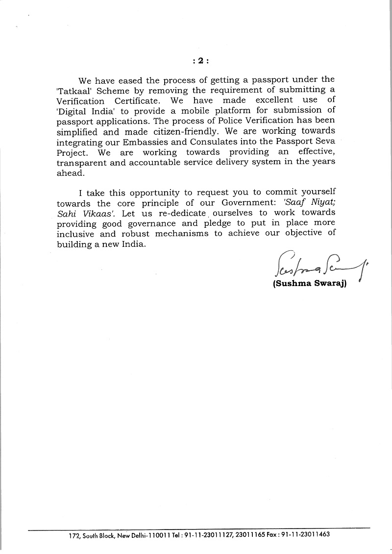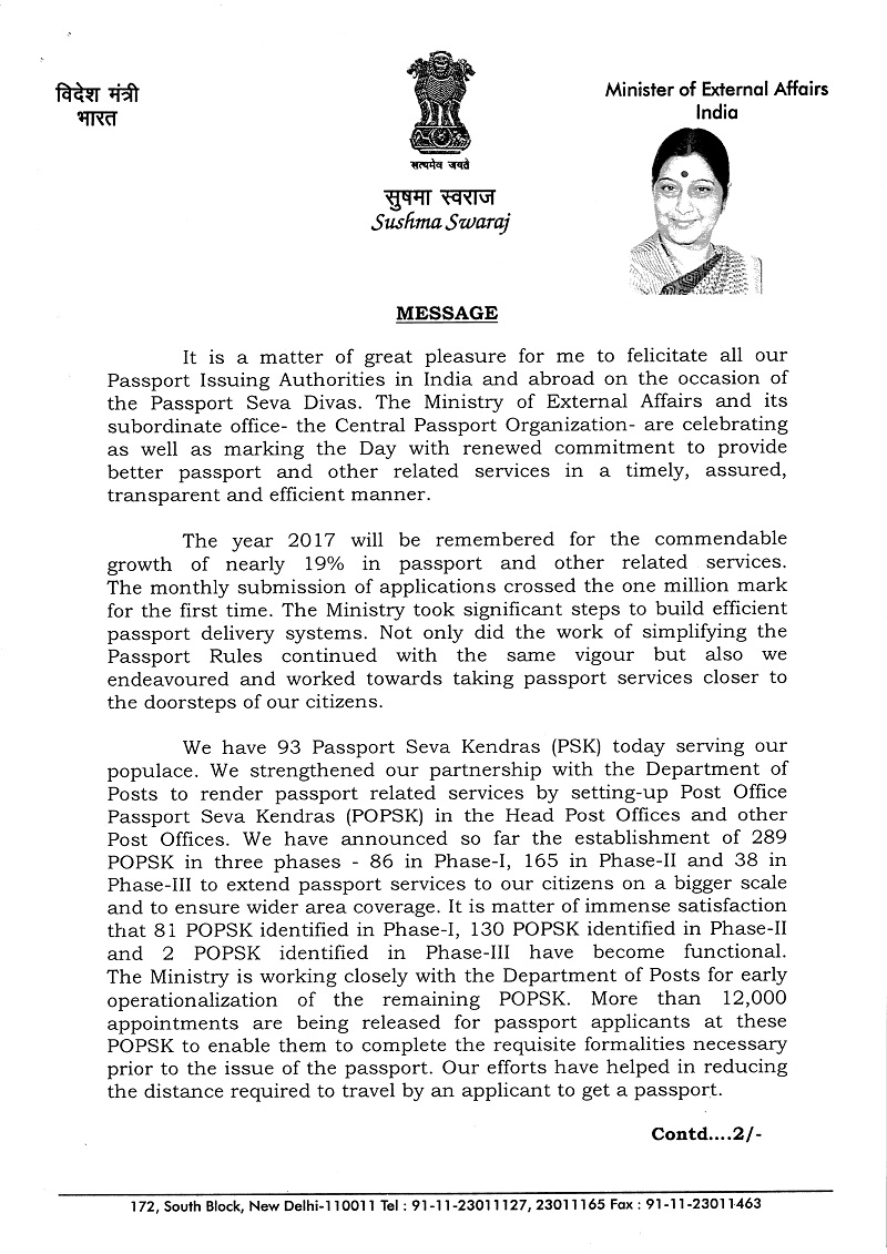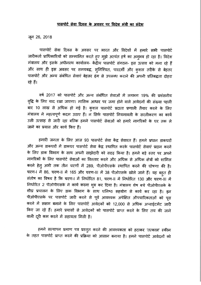 Hon'ble External Affairs Minister's Message On The Occasion Of 'Passport Seva Divas' 2018