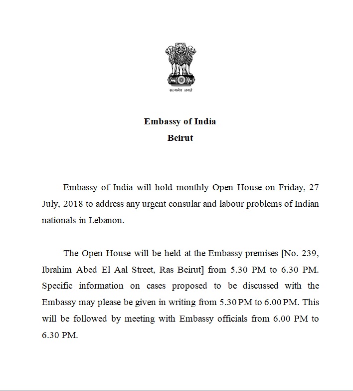 Embassy's Monthly Open House To Address Any Urgent Consular And Labour Problems Of Indian Nationals In Lebanon - July 2018