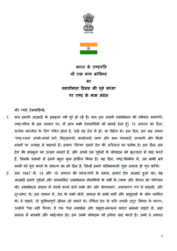 Address By Hon’ble President Of India Shri Ram Nath Kovind On The Eve Of 72nd Independence Day Of India
