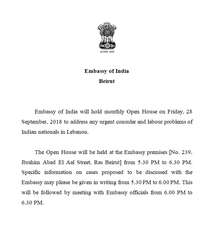 Embassy's Monthly Open House To Address Any Urgent Consular And Labour Problems Of Indian Nationals In Lebanon - September 2018