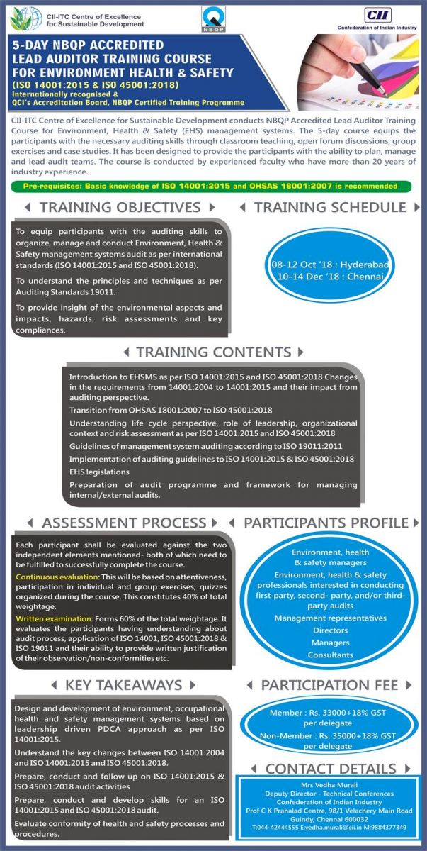 October 04, 2018We are pleased to forward you the details of the 5-day NBQP Lead Auditor Course on ISO 14001:2015 & ISO 45001:2018 for your information. Please find below the mailer for your information.