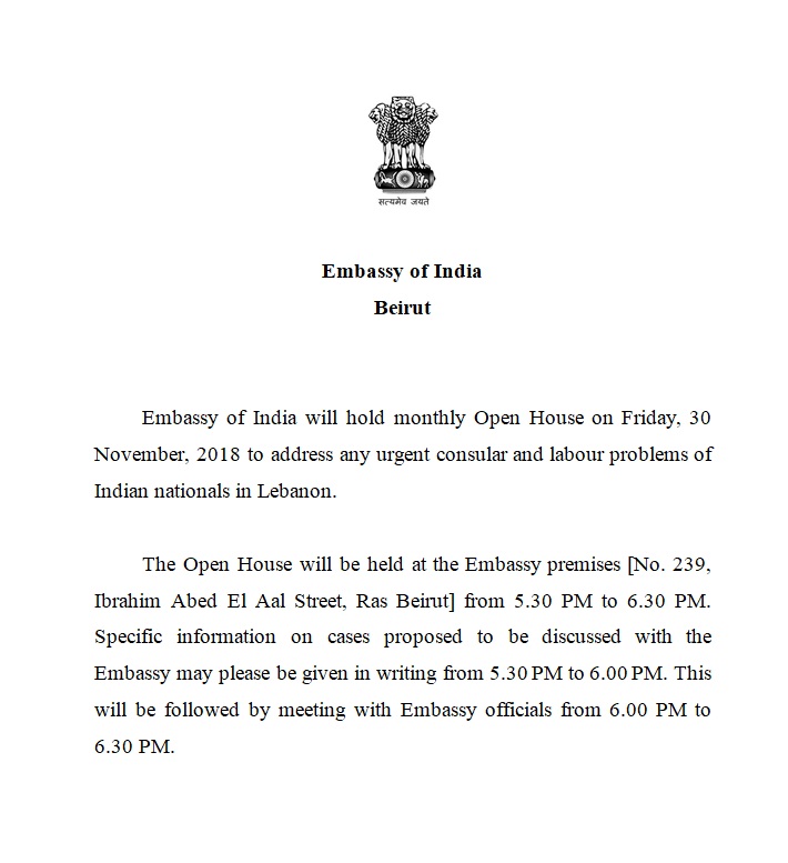 Embassy's Monthly Open House To Address Any Urgent Consular And Labour Problems Of Indian Nationals In Lebanon - November 2018