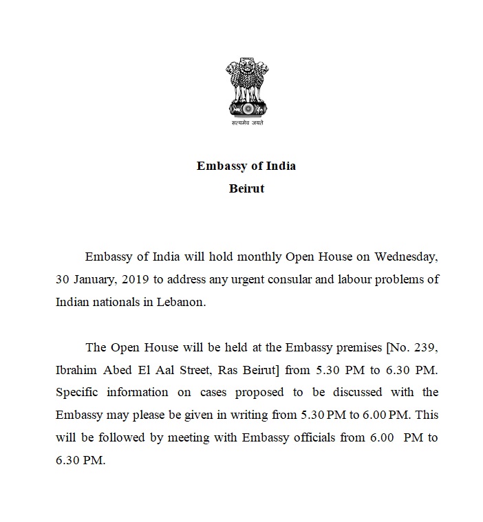 Embassy's Monthly Open House To Address Any Urgent Consular And Labour Problems Of Indian Nationals In Lebanon - January 2019