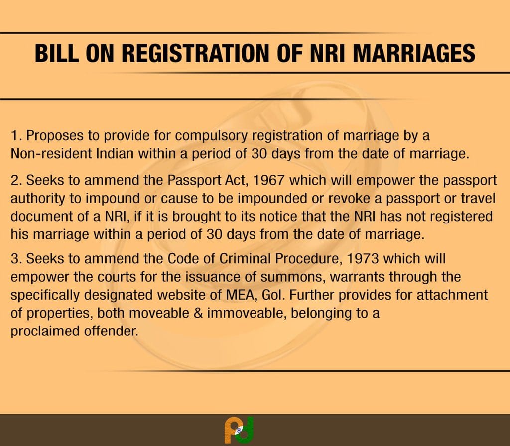 Hon'ble External Affairs Mininster Smt. Sushma Swaraj introduced pathbreaking Bill on Registration of Marriage of NRIs in Rajya Sabha to offer greater protection to Indian women married to NRIs.
