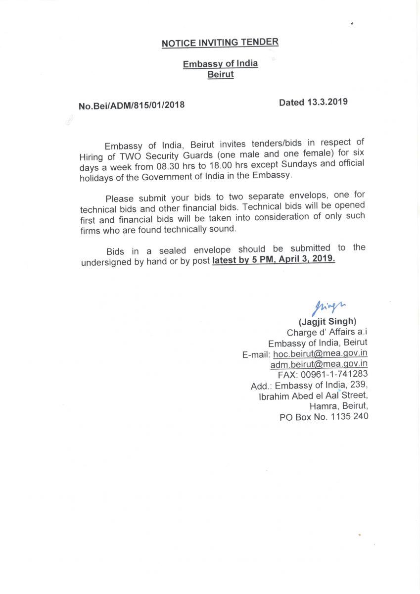 Notice Inviting Tender - Hiring Of 2 Security Guards (One Male And One Female)