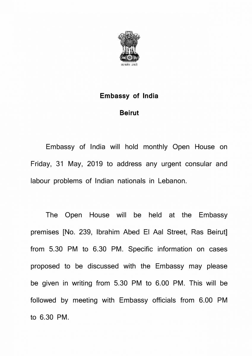 Embassy's Monthly Open House To Address Any Urgent Consular And Labour Problems Of Indian Nationals In Lebanon - May 2019