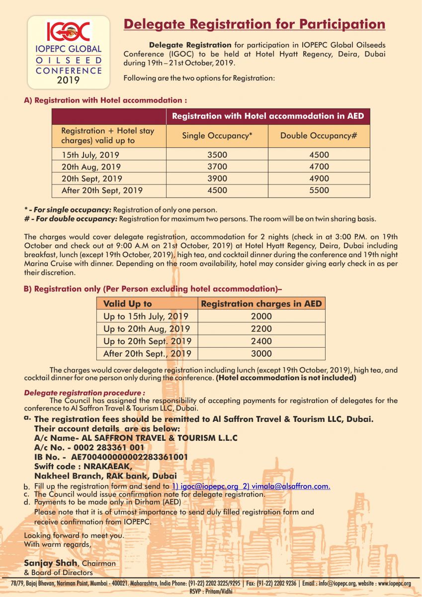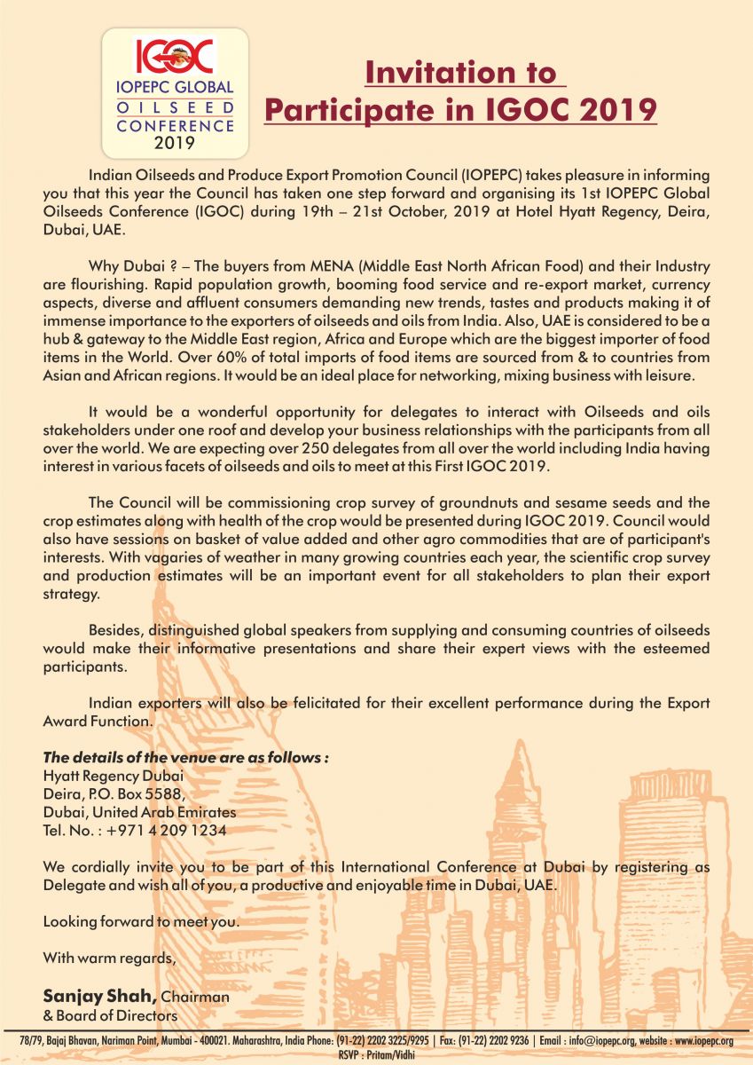 We are pleased to inform you that With the objective of development and promotion of exports of oil seeds, oils and various other agriculture commodities, Indian Oilseeds and Produce Export Promotion Council (IOPEPC) is organizing its 1st IOPEPC Global Oil seeds Conference (IGOC) during 19th – 21st October, 2019 at Hotel Hyatt Regency, Deira, Dubai.