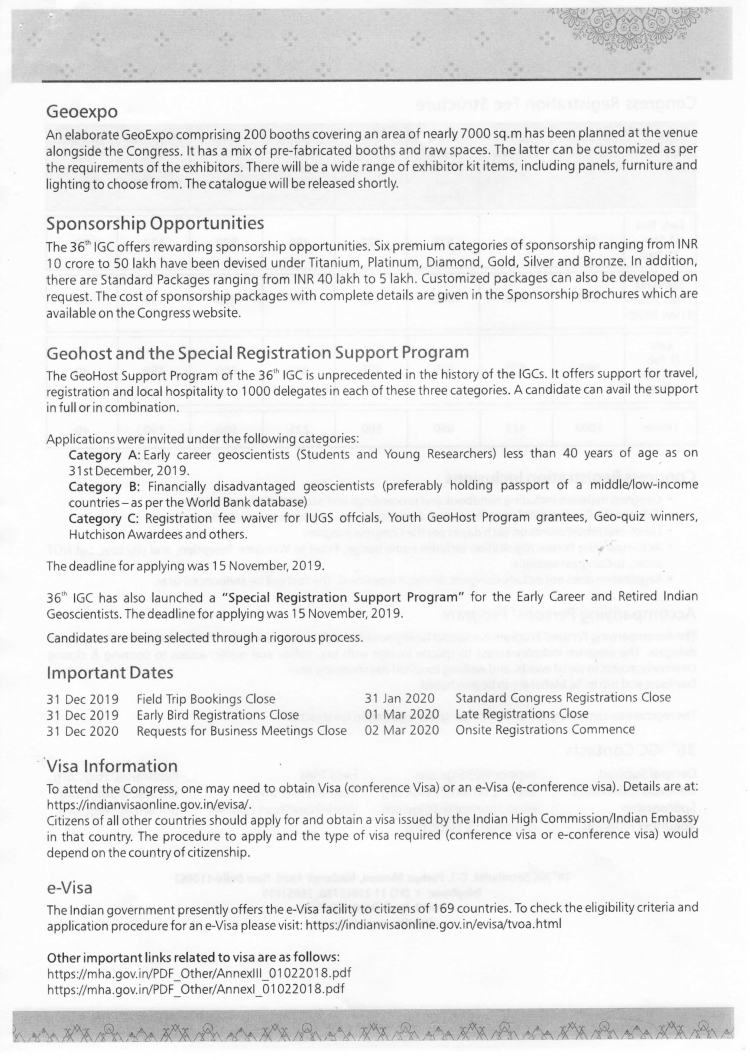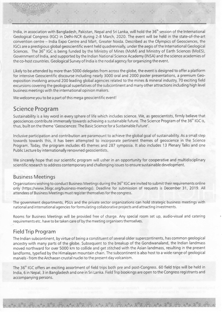 January 22, 2020India with the support of its neighboring countries is hosting the prestigious 36th International Geological Congress (IGC) during 2-8th March, 2020 in NCR-Delhi at India Exposition Mart Ltd, Greater Noida-201305. Acknowledged as the Olympics of Geo-science Conferences, IGCs are held quadrennially under the aegis of the International Union of Geological Sciences (IUGS). For more details, kindly reach out to the event's website 36igc.org