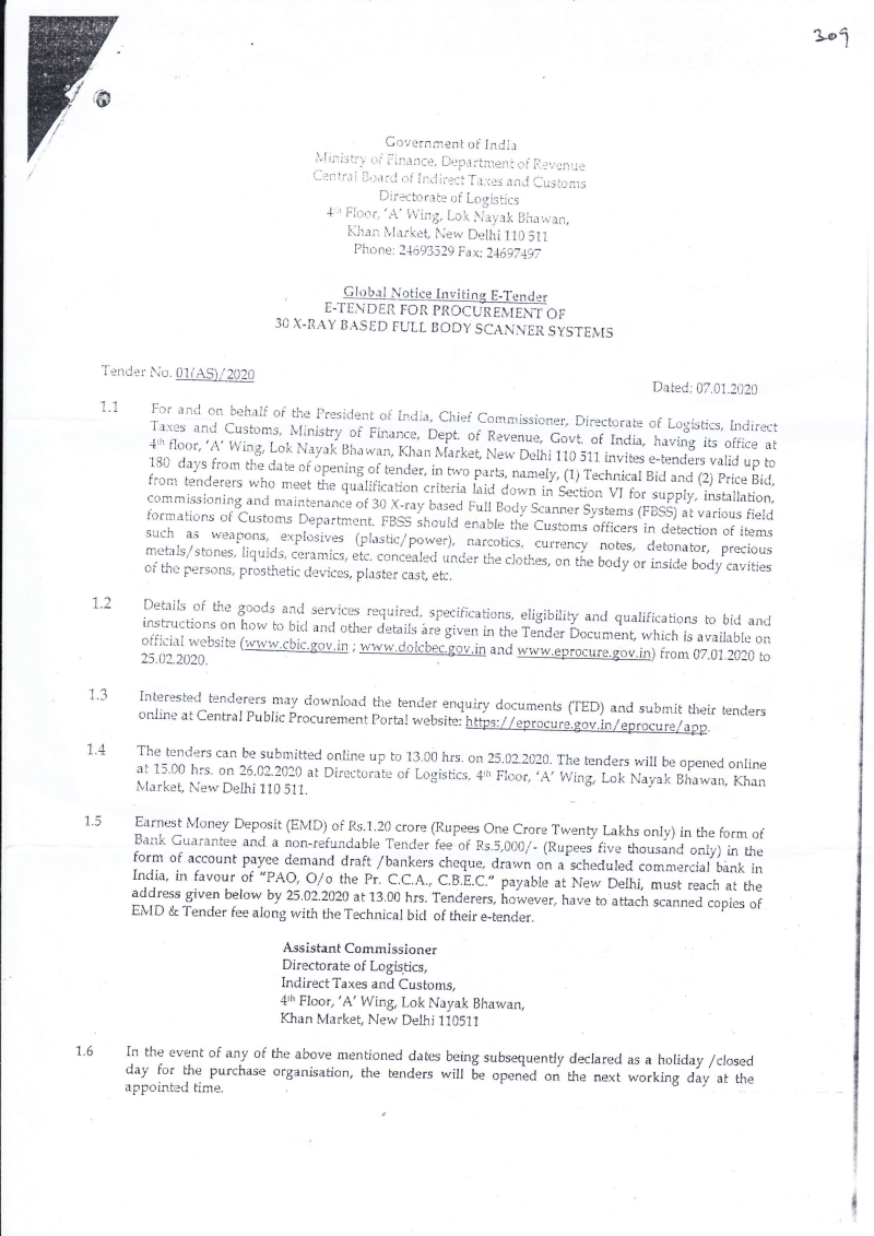 Global E-tender Notice For Supply, Installation & Commissioning Of 30 Full Body Scanners (Global E-tender No.01(AS)/2020 Dated 07.01.2020)
