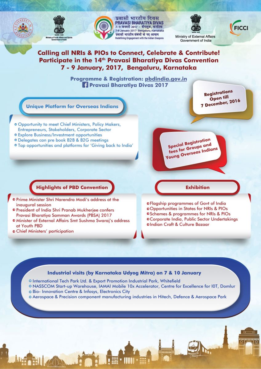 The 14th Pravasi Bharatiya Divas Convention will be held from 7-9 January 2017 in Bengaluru. The programme for the event and other details regarding PBD 2017 can be seen in the new portal for PBD (www.pbdindia.gov.in). Delegates have to register online and make payment of Registration Fees through the Payment Gateway on this portal. Those interested may please register before 7 December 2016.