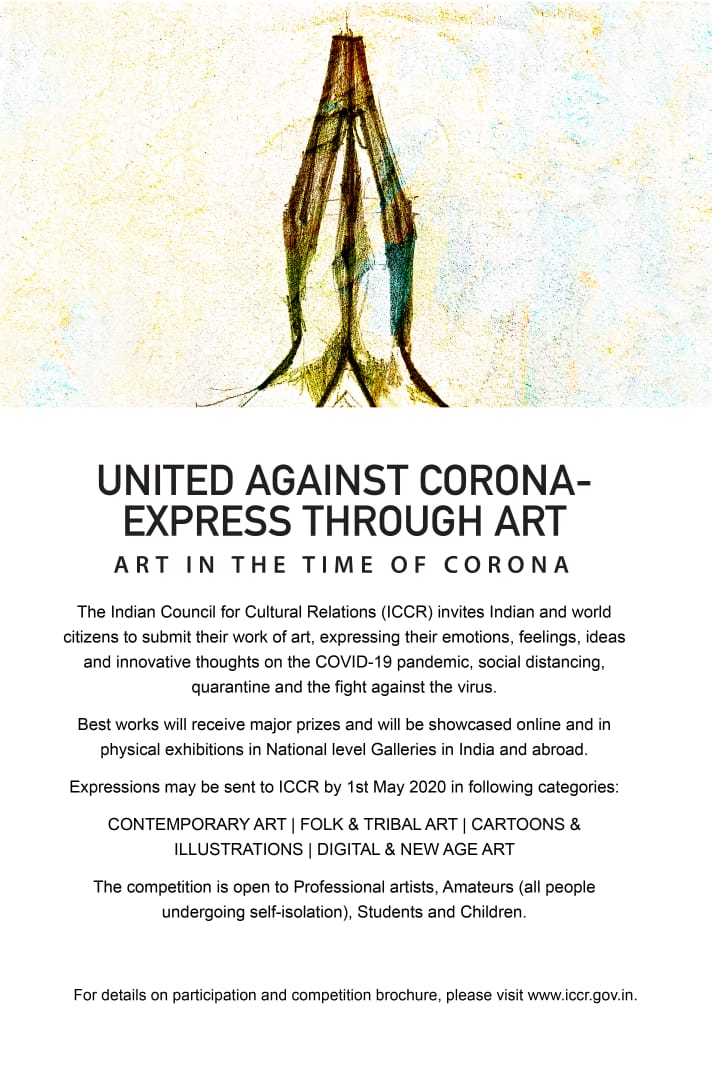 2. The Indian Council for Cultural Relations (ICCR) with its focus on building cultural links with countries around the world and connecting people to people through Cultural and Educational exchanges, calls on Indians and citizens of the world to express these emotions through a competition entitled United against CORONA- Express through Art.