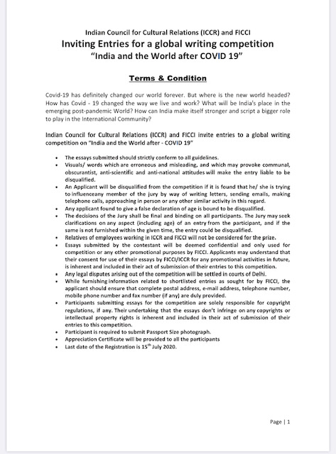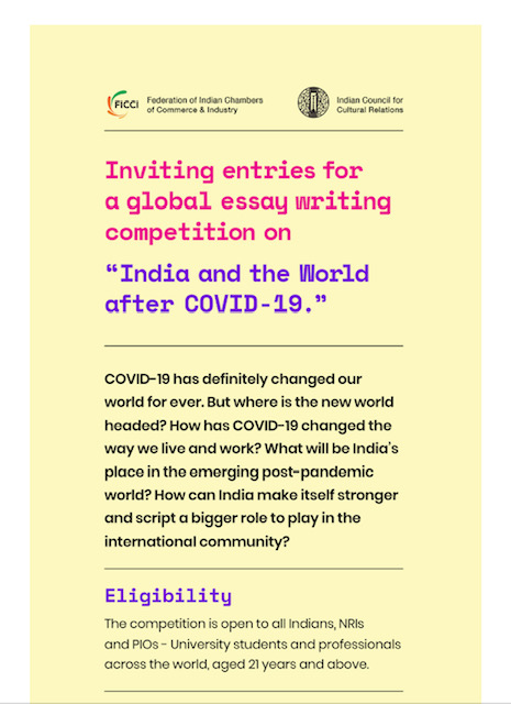 June 15, 2020A Global Essay Writing Competition “India and the World after Covid-19“ is being launched by FICCI in collaboration with ICCR. As the topic of the essay suggests, the entries are sought from only Indians, PIO and OCIs to write about the impact of the Covid-19 pandemic and how the world has changed and where India fits in and what could be the role of India in shaping the post-Covid world order and what should be our priorities. The competition is also in the run-up to FICCI’s participation in World Expo-Dubai later this year.