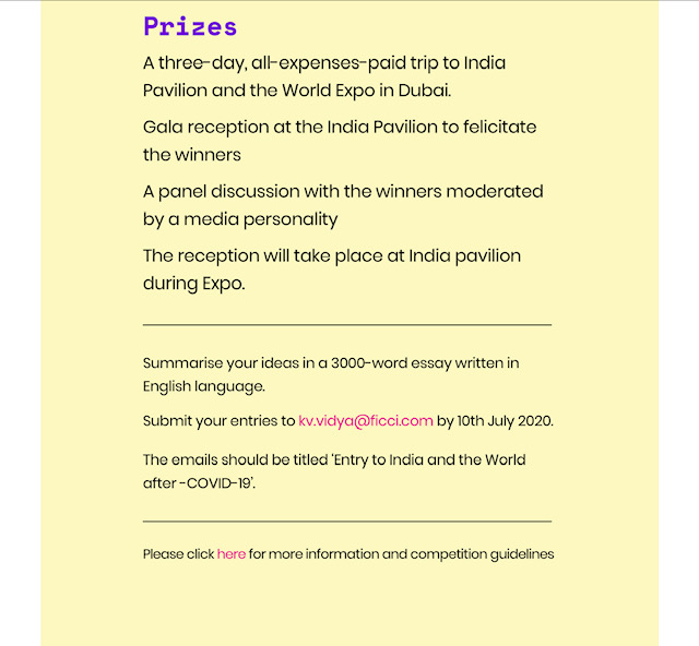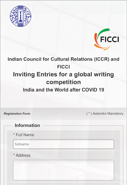 2. The last date for submission of entries is 15 July 2020. The essay competition is open to Indians, PIOs and OCIs only. Further details are available on FICCI website and the weblink given below takes a reader to overview, prizes, eligibility and registration where it is mentioned to click ‘here’ to register online which opens a new registration page.