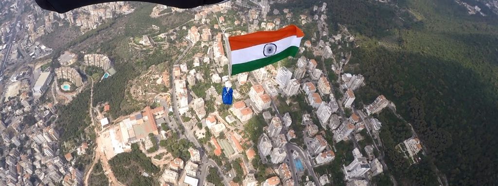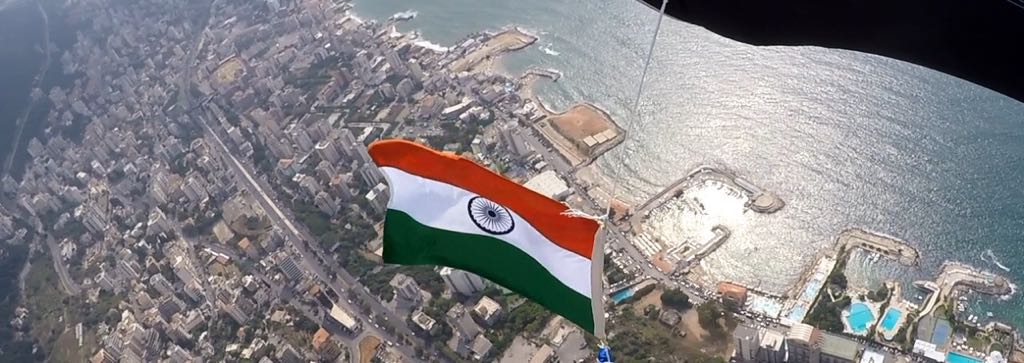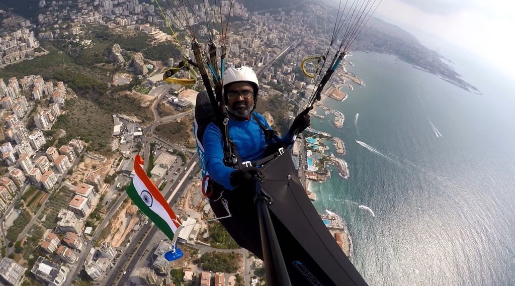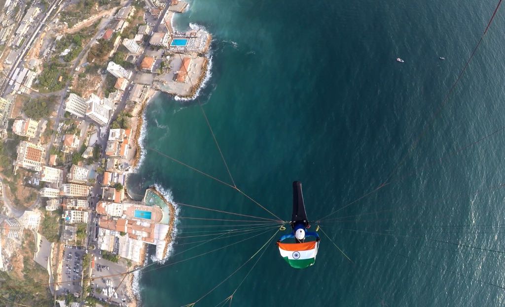 India@70 soaring to new heights: Indian para-glider M Arumugam flying the Tricolour high in Lebanese skies over the Mediterranean on 71st Independence Day of India.
