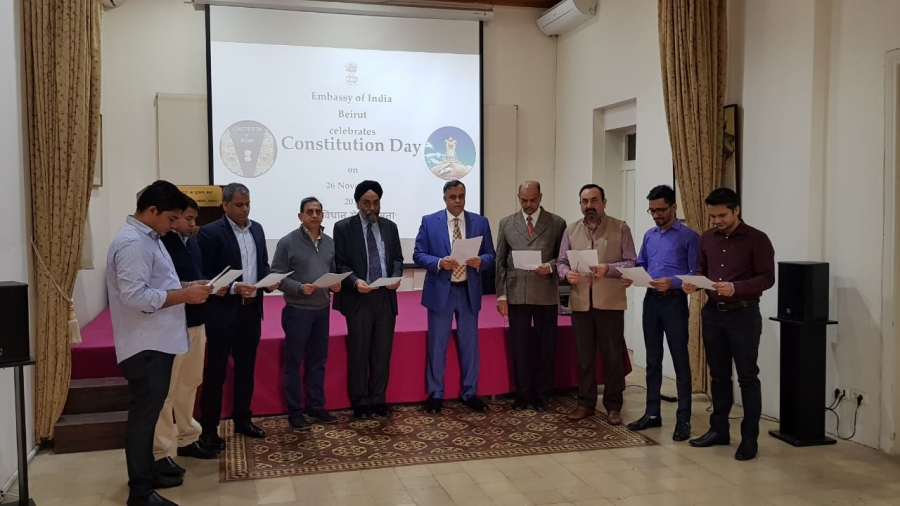 Ambassador Dr. Suhel Ajaz Khan and Officials of the Embassy reading the Preamble to the Constitution on Constitution Day - 26 November 2019.