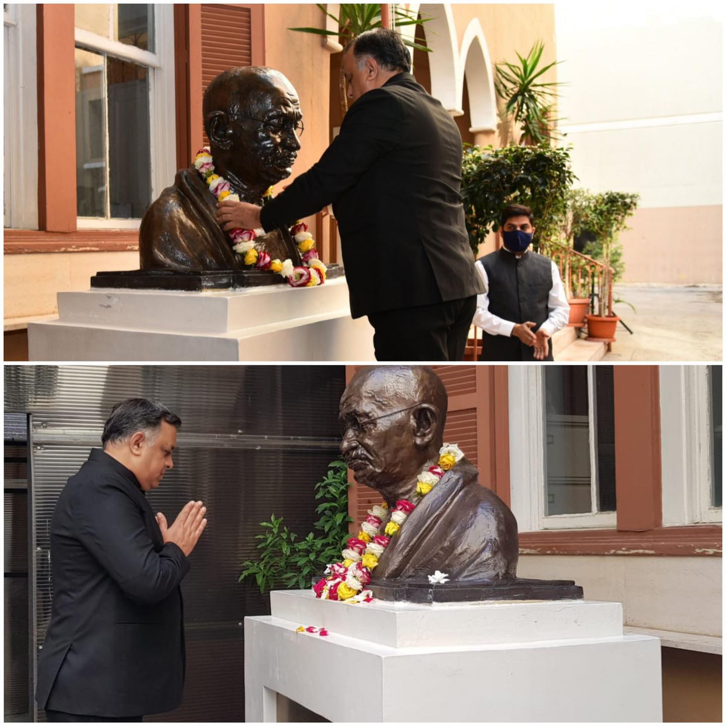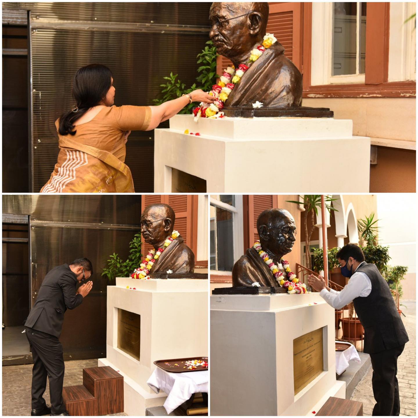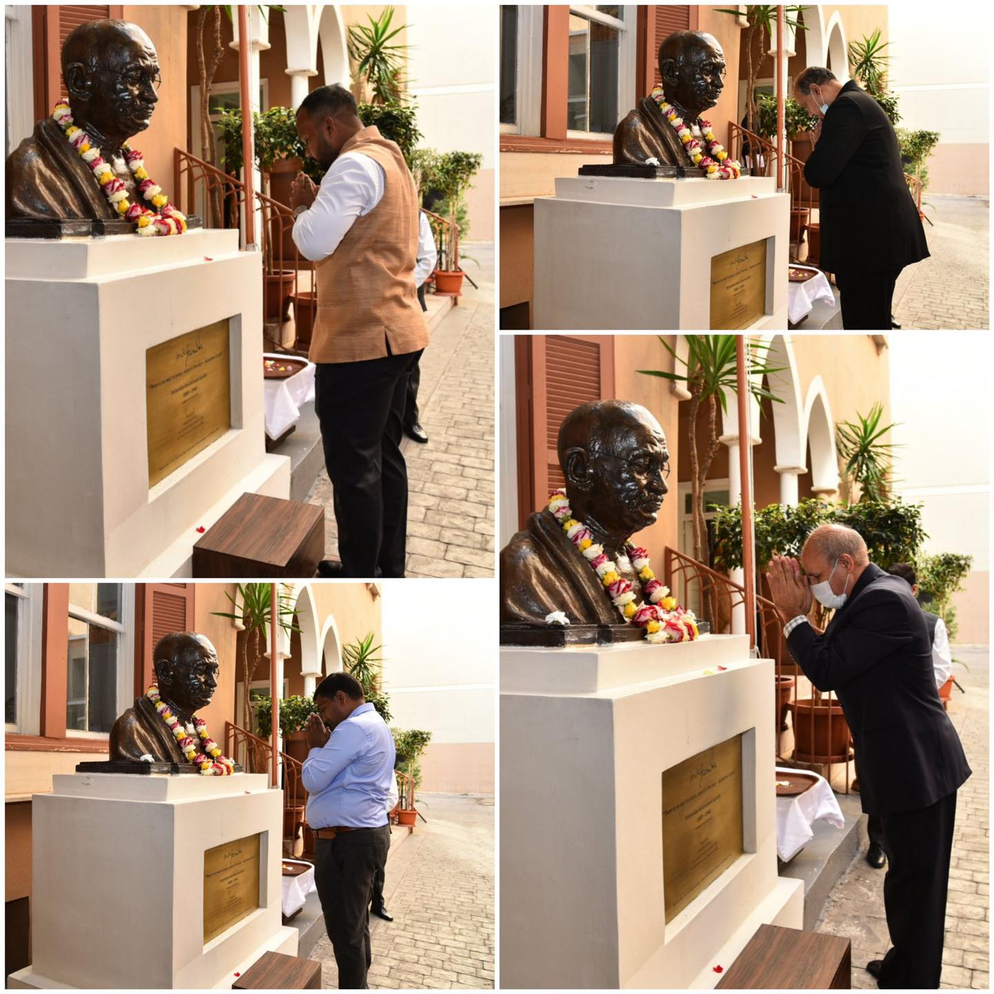On the occasion of 152nd birth anniversary of Mahatma Gandhi, Ambassador Dr. Suhel Ajaz Khan & all staff members of the Embassy paid floral tributes to Mahatma Gandhi on October 2, 2021 & pledged to rededicate themselves to the Gandhian ideals of truth, non-violence, swachchta and sarvodaya.