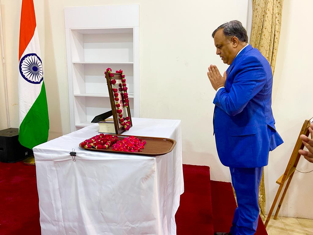 April 14, 2022As part of Azadi ka Amrit Mahotsav, the Embassy of India organised Birth anniversary of Dr. Bhim Rao Ambedkar on 14 April 2022 at the Embassy premises. The event was graced by Shri Ram Swarup, an eminent member of the Indian diaspora along with other community members. The event commenced with the garlanding of the portrait of Baba Saheb by the Ambassador Dr. Suhel Ajaz Khan. Mr. Ram Swarup joined the Ambassador and paid floral tributes. The event was also attended by all members of the Embassy.